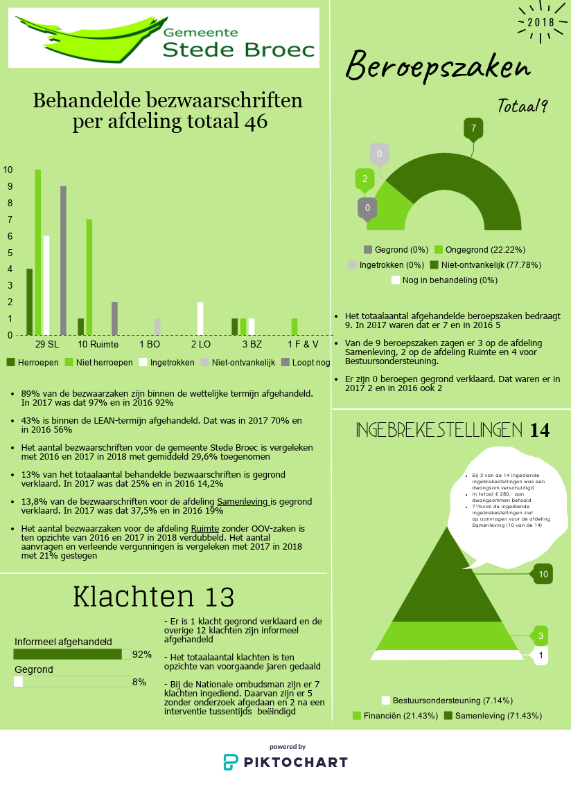 Tijdige/correcte besluitvorming op bezwaarschriften | Het aantal bezwaarschriften is ten opzichte van 2017 met bijna 30% toegenomen tot 46 stuks. | 89% van de bezwaarschriften is binnen de wettelijke termijn afgehandeld. Mede door de toename in absolute aantallen is het aantal binnen de LEAN termijn afgehandelde bezwaarschriften teruggelopen naar 43%* |